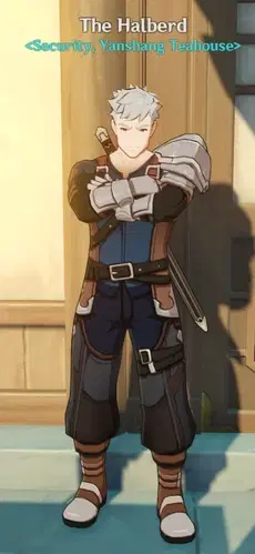 Это - мужчина-охранник чайного дома "Яньшан" наравне с девушкой, которую зовут в игре "Клык". Причём если "Клык" похожа на представительницу Ли Юэ, "Алебарда" - скорее приезжий.