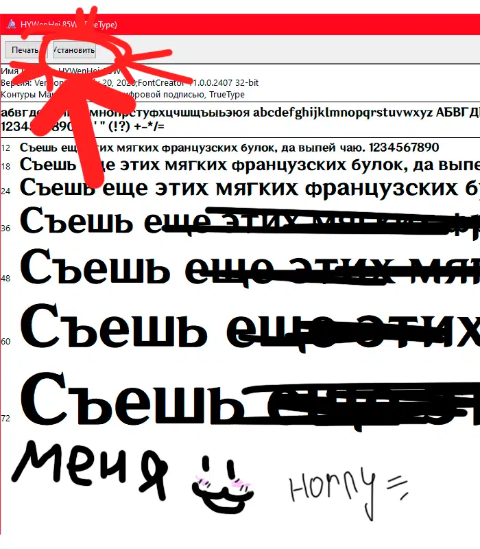 Открываем шрифт и нажимаем УсТаНоВиТь