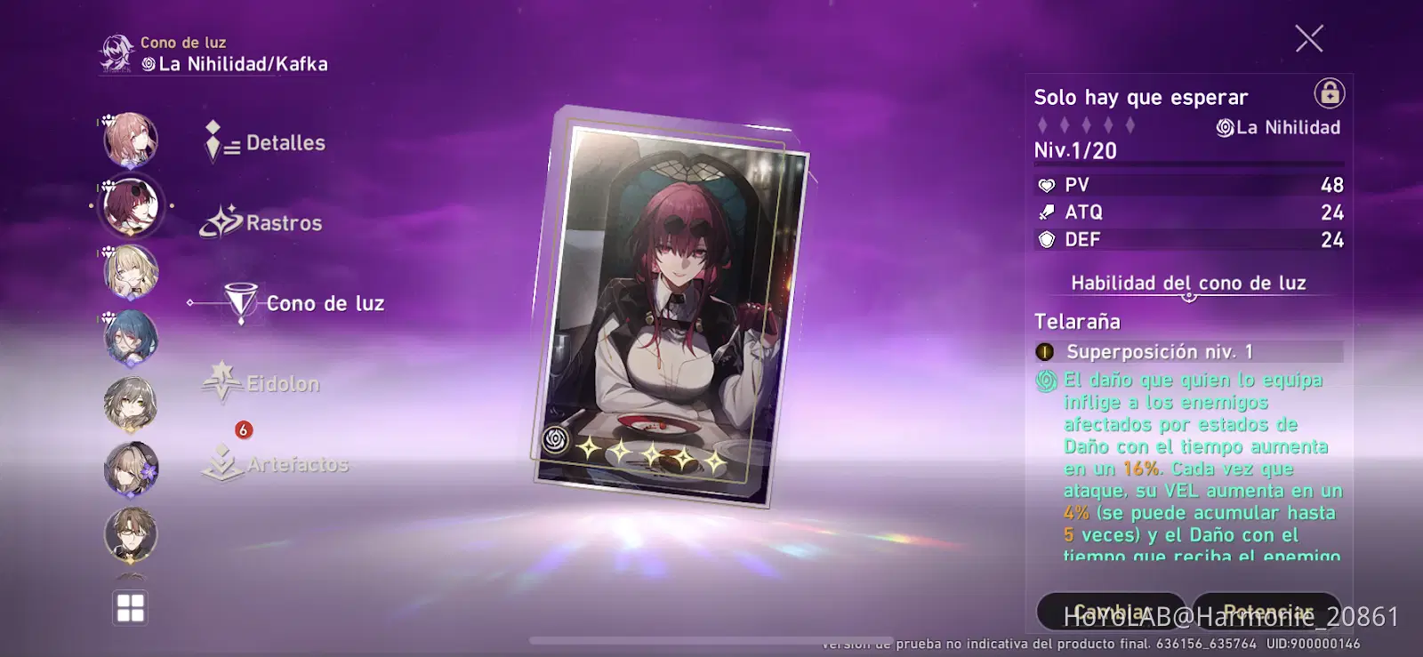 Il existe plusieurs alternatives de cône de lumière en attendant son cône signature. Les cônes qui peuvent marcher avec Kafka seront des cônes de lumière de Nihilité. Ce sont les seuls cônes dont leur compétences marchent avec Kafka car c’est un personnage de Nihilité. Tous les autres personnages marchent de la même façon avec les cônes de lumière.