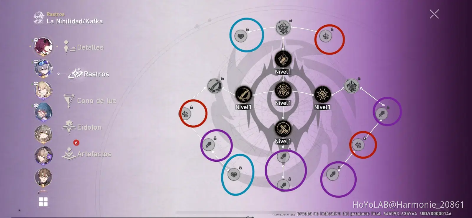 ➣ L’arbre de compétences de Kafka se présente comme ceci. Il y a 5 compétences principales qui sont les actions qu’elle pourra effectuer. Les autres sont des pouvoirs additionnels qui viendront booster les compétences de Kafka et des bonus d’attributs qui vont rajouter des stats supplémentaires au personnage.