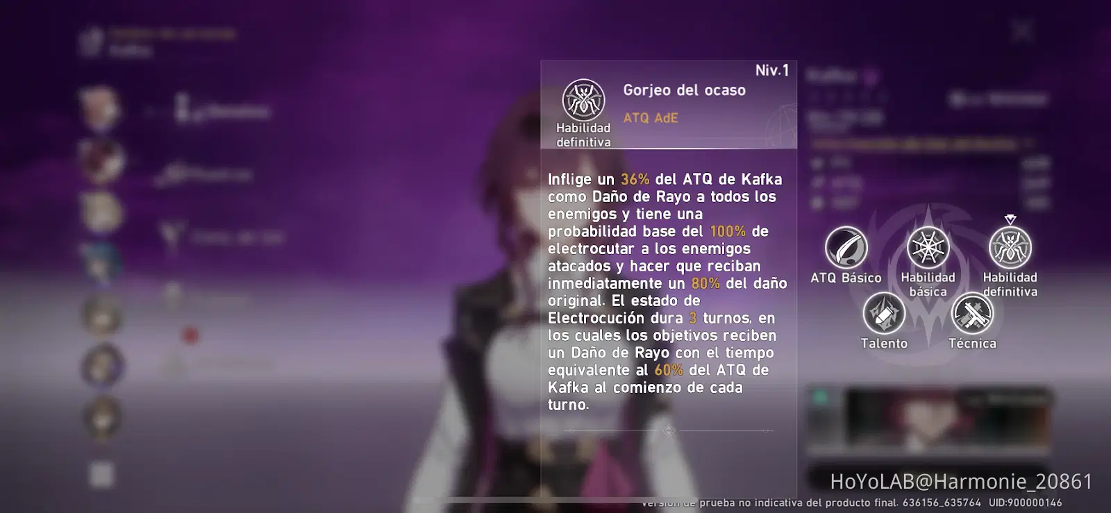 ➣ Une attaque multicible qui touche tous les ennemis. La compétence ultime de Kafka inflige des dégâts électriques et peut électrocuter ses ennemis qui recevront une grande qualité de dégâts. Les ennemis électrocutés se verront affectés par des dégâts électriques avec le temps au début de chaque tour.